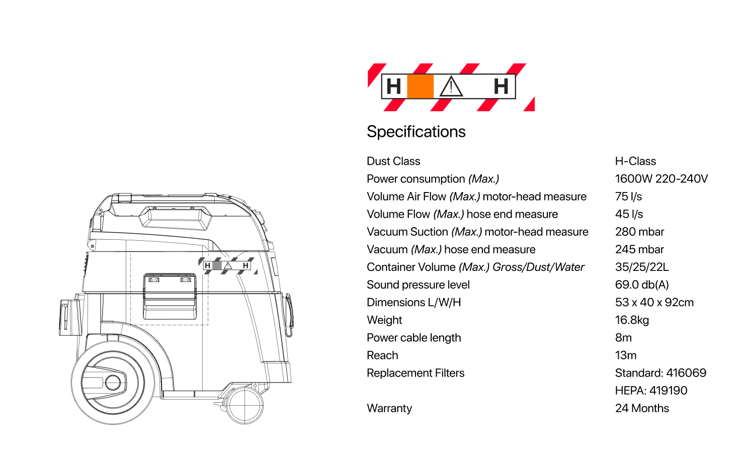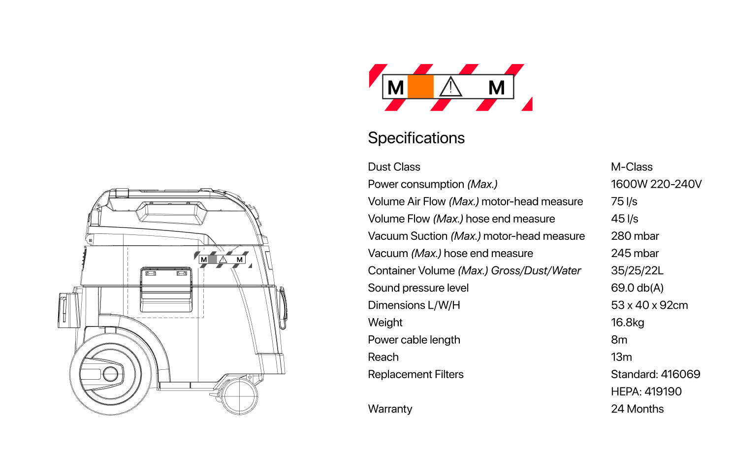 Sized at 35L, this super industrial-grade wet and dry extractor designed for the most demanding of requirements. It features patented iPulse self-cleaning technology, guaranteeing permanently clean filters. The advanced system cleans filters in 3.5 seconds during machine operation, eliminating downtime and intake flow operations. The twin polyester cartridge filters provide 99.9% dust retention and are specifically designed for the thickest to finest duts filtration requirements. Filters are fully sealed from the waste canister for safe access. The lightweight, high-speed motor generates airflow at 64 litres /sec. with a variable control knob and powerful suction at 259 mbar (3.8psi). Featuring bypass cooling for wet and dry vacuuming and liquid overflow protection with electronic shut-off sensors. Fitted with hose storage and accessory fixation points. Tuned electronics allows the extractor to power on/off automatically once it is switched on. Smooth running undercarriage easily rides over inconsistent work site terrain. Tool-free Twist and Lock hose connection ensures minimal twisting or accidental loosening during operation. Designed to run continually, day in and day out.